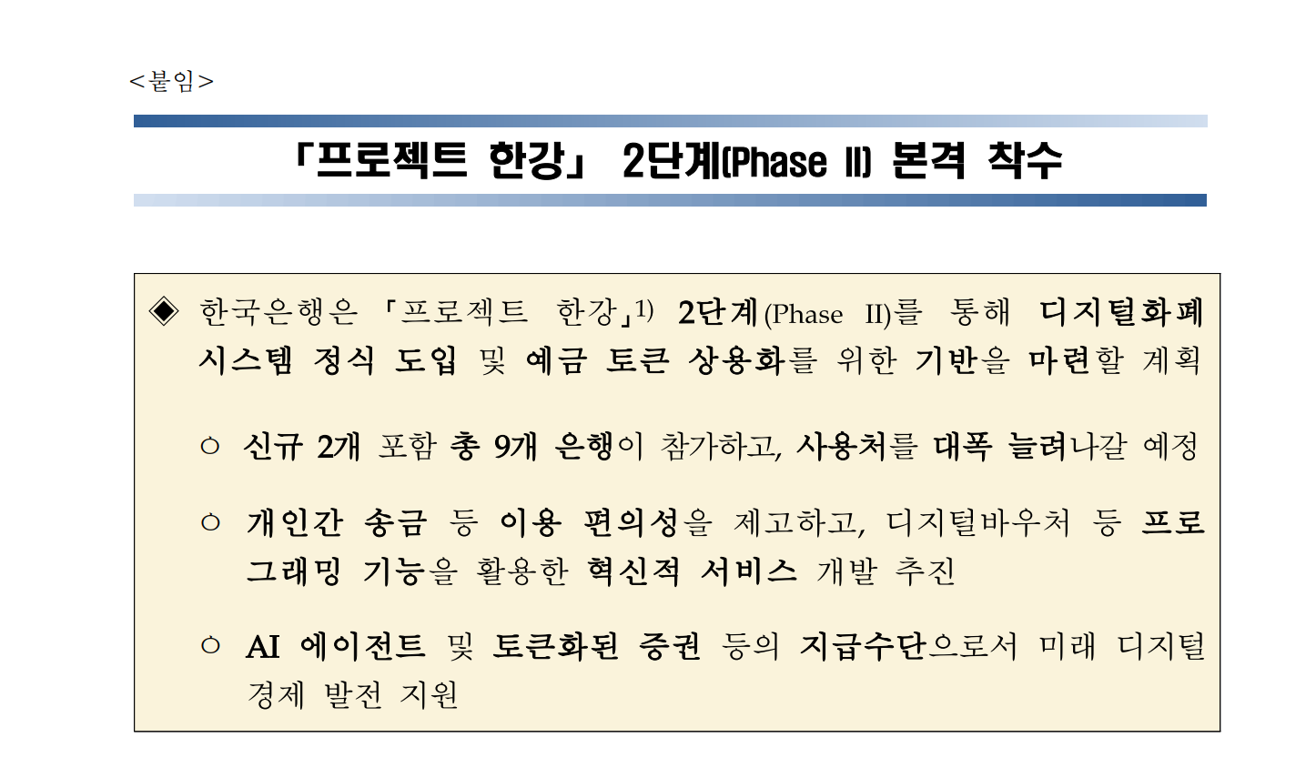 여기서 예금토큰은 민간 원화 스테이블코인이나 범용 CBDC와는 성격이 다르다. CBDC는 중앙은행이 직접 발행하는 디지털 화폐이고, 프로젝트 한강에서의 예금토큰은 은행예금을 토큰화한 형태로 은행이 발행·유통하는 지급수단이다. 이 구조는 기관용 CBDC를 기반으로 예금토큰 같은 민간 디지털통화를 뒷받침하는 방식이며, 예금토큰은 현재의 은행예금과 기능·구조가 유사한 자산으로 설계된다. 즉 중앙은행이 직접 국민에게 돈을 발행하는 구조라기보다, 중앙은행 화폐를 결제의 최종 안전자산으로 두고 그 위에서 은행 예금을 토큰 형태로 유통시키는 모델에 가깝다.
