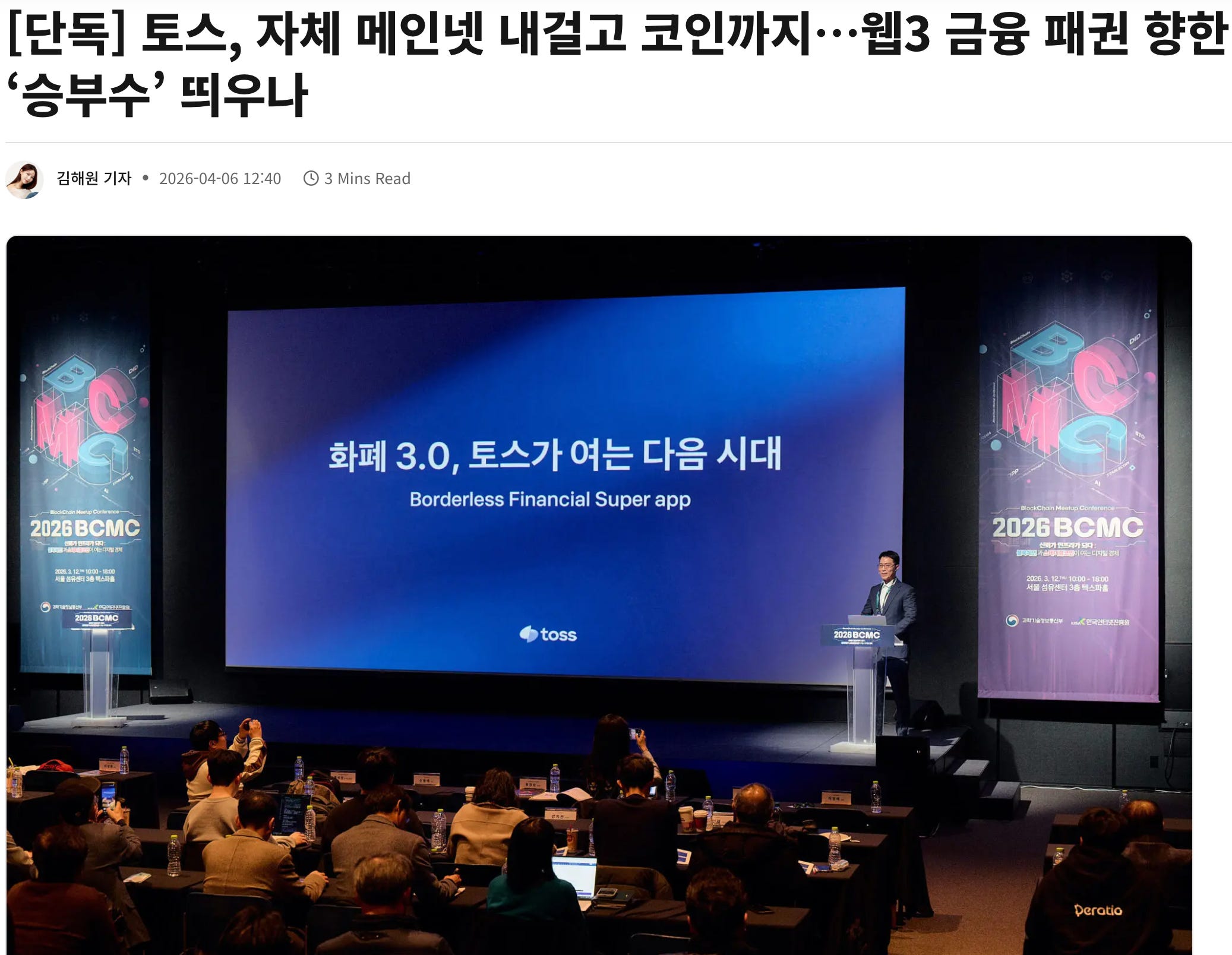 토스가 자체 메인넷과 코인 발행을 검토한다는 보도가 오늘 4월 6일 공개되었다. 블록미디어 보도에 따르면 토스는 레이어1 기반 네이티브 토큰과 지갑을 포함한 통합 디지털자산 생태계를 논의 중이고, 지난해에 TOSSKRW 등 원화 스테이블코인 관련 상표를 출원했으며, 별도 앱 설치 없이 토스 앱 안에 지갑 기능을 넣는 방향도 검토하고 있다. 3천만 사용자 기반, 토스플레이스 단말기 확산, 미니앱·디앱 유통 구조까지 함께 결합할 수 있는 스테이블코인 산업의 메기인 셈이다. 아직 확정된 실행안으로 단정할 단계는 아니지만, 적어도 토스가 원화 스테이블코인을 관심 주제가 아니라 “준비 중인 사업 영역”으로 다루고 있다는 점은 분명하다.
